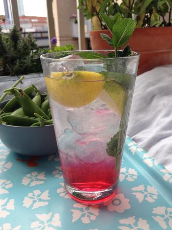 Fyld godt med is i fire glas. Fordel hybenrosesirup i de fire glas. Skær citronen i 8 dele, og fordel saften og resten af citronen i de fire glas. Tag de fire myntekviste, og slå dem let mod hånden for at bringe smagen frem, og sæt derefter en kvist ihvert glas, og top med dansk vand.